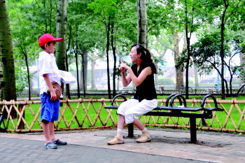 ▲李培正妈妈鼓励他再卖10份报纸,就同他一起吃饭。 本报记者 王鸿哲 摄
