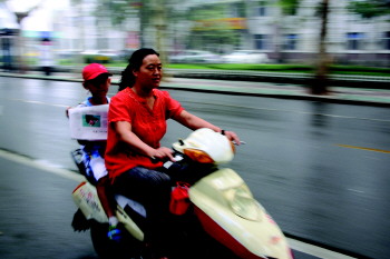 ▲小报童周春龙的妈妈每天陪都他卖报,风雨无阻。 本报记者 王鸿哲 摄