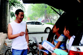 ▲小报童编外家长给小报童传授卖报方法。 本报记者 姜文洁 摄