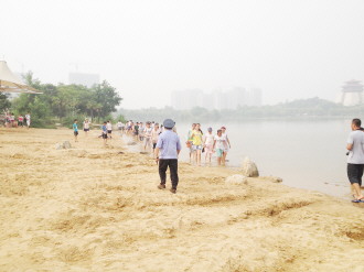 23日下午4时许,一群暑假培训班的学生在下课之后,集中到东湖游玩,近二十多名学生刚到沙滩地儿,便有学生冲入湖中,此时水深到达大腿处,甚至有的学生直接将脸埋在水中。刚刚制止完捕鱼者返回岸边,这一批学生的到来,又让保安忙活起来。