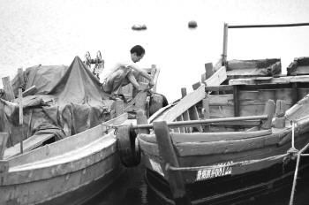 24日上午,烟台芝罘岛西口码头,一名船主正在两船之间绑轮胎,防止大风天船体发生激烈碰撞。 本报记者 赵金阳 摄
