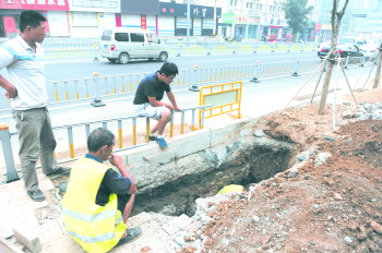 24日,一群工人在和平路西头北侧破口挖洞,废渣占据了人行道和自行车道。据工程人员说要埋设电力电缆。途经的市民不解:路刚刚修好通车,这才几天咋又挖开了?