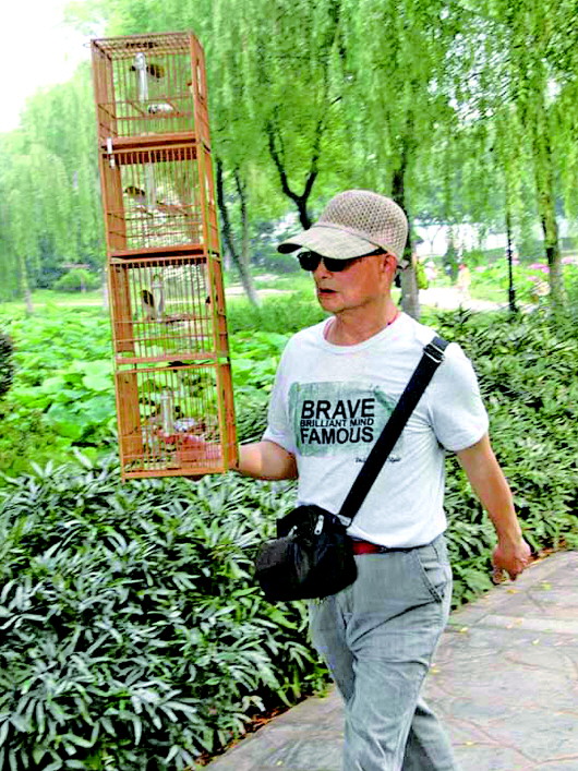 自述:单手托着4只鸟笼,一边晨练,一边遛鸟。