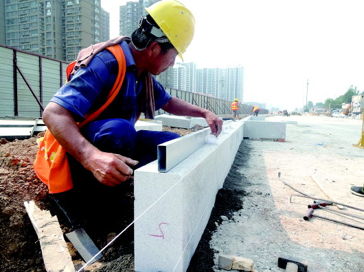 凤凰路正在紧张建设中,工人们每人都带着毛巾,方便擦汗。 通讯员 于涛 摄