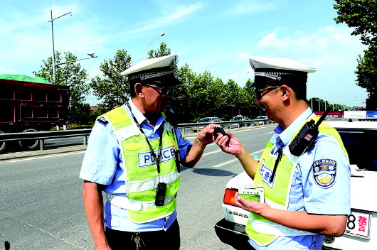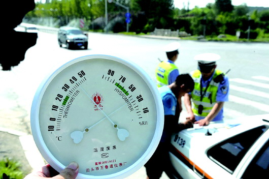 温度逼近40℃,交警仍坚持在路面执勤。 通讯员 李明珠 摄