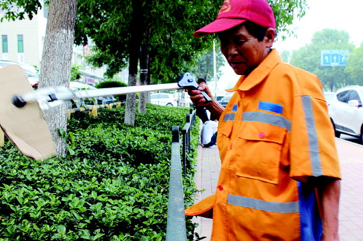同样奋战在一线的还有环卫工们。22日下午1点半,在工业南路与开拓路交叉路口处,路面温度高达40多摄氏度,环卫工冒着高温清扫路面垃圾,满头大汗浸湿了头发和遮阳帽。环卫大姐说,“创建卫生城市,道路上不能有垃圾。”