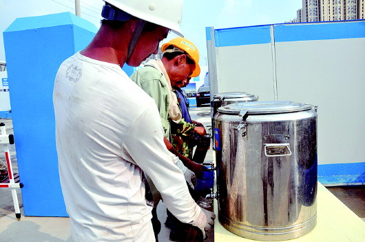汉峪金谷项目工地上摆放着防暑饮品,供工人们饮用。 本报记者 任丽媛 摄