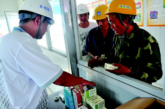 汉峪金谷项目工地发放降温防暑药品。 本报记者 任丽媛 摄