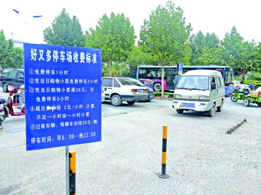 近日,好又多超市停车场多出了一块公示牌,牌子上写着“好又多停车场收费标准”:免费停车1小时;凭当日购物小票免费停车2小时;凭当日购物小票满38元可免费停车3小时;超出3小时按2/小时计算,不足一小时按一小时计算;过夜车辆,每辆车加收20元/辆。