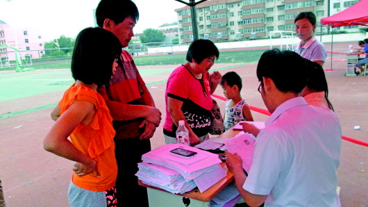 记者来到竞业园学校操场看到,济阳县教育体育局设置了6个报名处,每个报名处都排有200余米长的队伍,大约6000余人,每个孩子都有1-2名家长陪同。一遍遍查看报名所需的材料是否齐全。