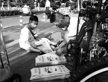 今天,我早早的去了“老战场”,一看,哎呀,已经有人看上报纸了,原来还有比我起的更早的鸟。我立马寻找买主,不放过一位顾客。“叔叔,买份报纸吧?齐鲁晚报,五毛一份。”“好的,小朋友,来一份。”就这样我今天的生意开张了。
