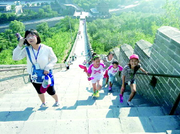 在24日的活动日程中,长城,无疑成为最让小营员们兴奋的景点。“长城,长城,我们来了……”当旅游车刚驶进居庸关,一座座烽火台突现眼前,小营员们欢呼起来。不到长城非好汉,小营员们按男女各分成五个小组,每组由年龄稍大的一名组长带领,拾阶而上,朝着一个个峰火台进发。