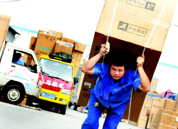 左图:把冰箱搬到货车边,包装箱已经被汗水浸湿了一片。