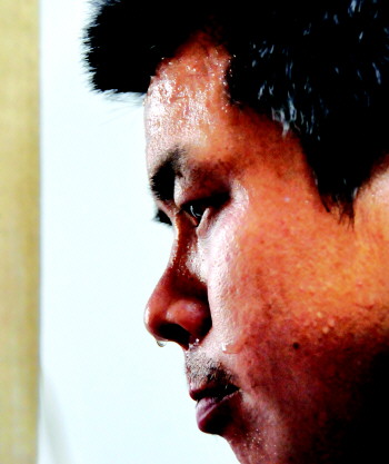 右图:一口气爬上5楼,孙本立脸上挂满了豆大的汗珠。