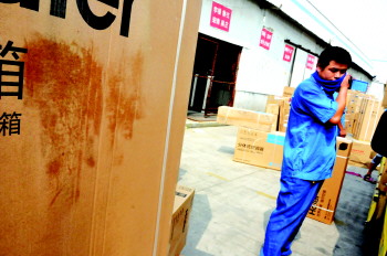 23日上午11点,城区火炬路的九龙家电送货中心,仓库里排满了大大小小的箱子,送货工人正在紧锣密鼓搬箱、装车。孙本立把一台冰箱从仓库中拖出来,递给车上的两名同事,工作服已经完全湿透,“这太正常了,出去跑一天回来比这还狼狈。”孙本立笑着说。