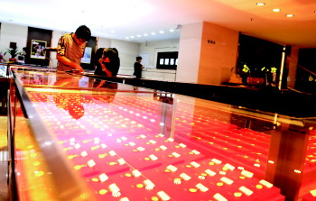 24日,在市区一家金店内,来买黄金饰品的顾客不是很多。金价下跌一定程度上影响了市民的购买信心。 本报记者 韩逸 摄