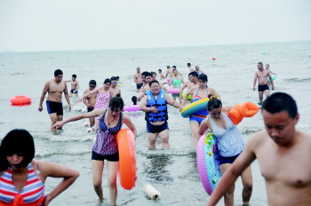 24日下午,第一海水浴场播音器发出台风预警提示,提醒海中玩耍的游客尽快上岸,保证人身安全。