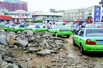 7月24日,在德州市火车站出站口外,因改建需要路面毁坏,预留出的旅客出站道路挤满出租车,旅客来往十分不便。 本报记者 王小会 摄