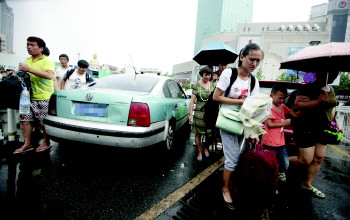 23日,在青岛火车站附近,旅客在雨中打车,而一旁的出租车挑客严重。