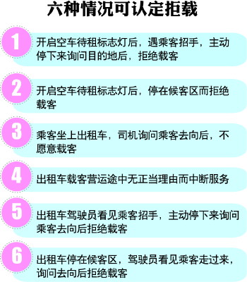 “出租车驾驶员无正当理由拒载乘客,是一种违章行为,应予以纠正或处罚。但真正属于拒载的一般有六种情况。”市交通运输监察支队违章办主任王磊说,一是开启空车待租标志灯后,遇乘客招手,主动停下来询问目的地后拒绝载客的;二是开启空车待租标志灯后,停在候客区而拒绝载客的;三是乘客坐上出租车,司机询问乘客去向后,不愿意载客的;四是出租车载客营运途中无正当理由而中断服务的;五是出租车驾驶员看见乘客招手,主动停下来询问乘客去向后,拒绝载客的;六是出租车停在候客区,驾驶员看见乘客走过来,询问去向后拒绝载客的。记者被拒的十几次,司机都是打着暂停灯,不主动开口询问目的地,因此无法认定是拒载。
