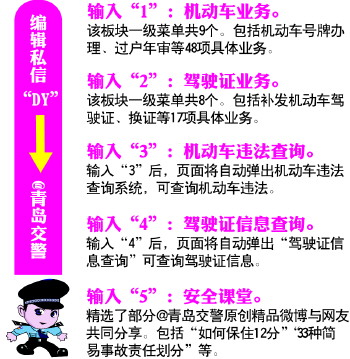 “@青岛交警”微博粉丝服务平台共分为微车管、微查询、微课堂三大板块,下设机动车业务、驾驶证业务、机动车违法查询、驾驶证信息查询、安全课堂五项业务。办理号牌、车辆过户、申领驾照、查询交通违法等79项具体业务都可以通过微博来办理。