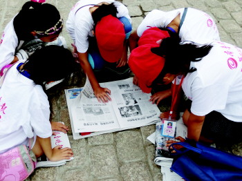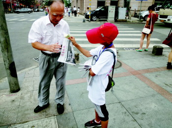小报童们正一起看本报关于营销秀活动的报道。 实习生 郭成 摄