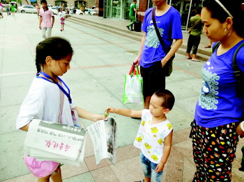 看到小报童辛苦卖报,一名小朋友“伸出援手”。 实习生 郭成 摄