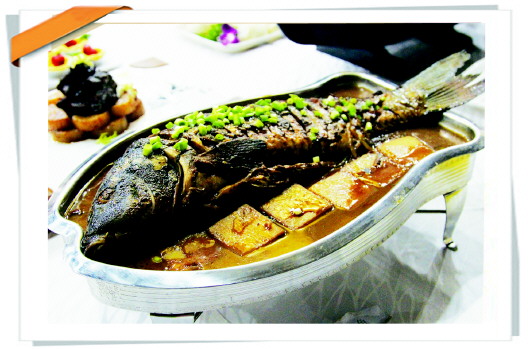 把鱼宰杀洗净,正反两面打直花刀,锅内放入胡姬花花生油,滑锅七成热,放葱姜、八角、干辣椒,然后放入野生鲤鱼,烹入料酒、散酱油、醋,再加入热水,大火烹煮18分钟,放入豆腐、粉条,小火炖12分钟,收汁出锅即可,出锅后放入青蒜苗、香菜、蒜。