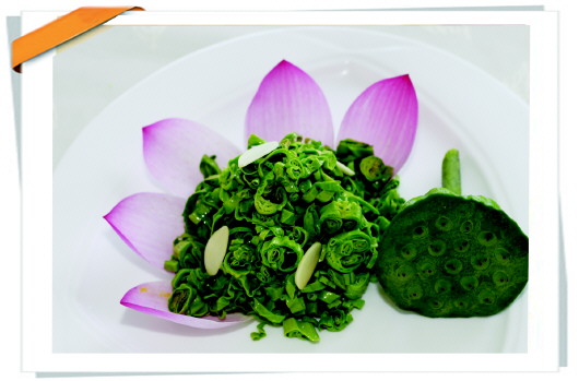 □制作方法:1、把嫩荷叶顶刀切丁,莲蓬取仔。2、锅内烧开水放入荷叶和莲子烫熟后用冰水侵泡5分钟,沥净水后加入调料、佐料拌匀放入摆好的荷花上即可。