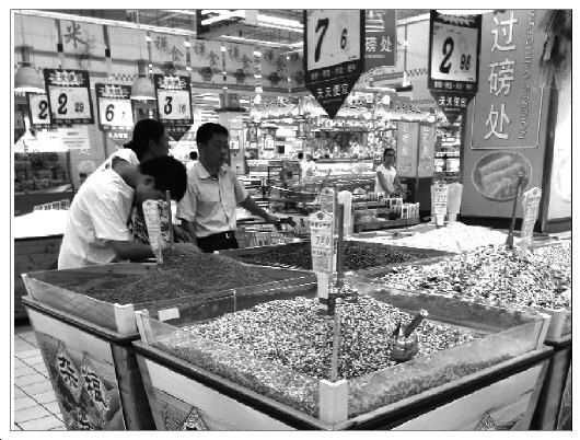 记者注意到,除了绿豆销售紧俏外,其他一些消暑降温的食材也成为市民选择的对象。记者走访市区花园路、文化路及鲁中大街四家大型超市的杂粮区发现,像小米、黑豆、红豆以及薏米等20余种杂粮摆满柜台,散装和分装的应有尽有。记者在莱芜大润发超市杂粮专区看到,短短十分钟内,就有十余位市民购买散装绿豆。