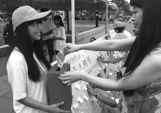 23日,在幸福门广场,威海市环保局、哈工大(威海)“天梦湖缘”暑期社会实践团与人大附中环保社团举行“爱在天鹅湖”的宣传募捐活动,30余名环保志愿者参加,募捐所得将用于救助受伤大天鹅。据了解,活动持续三天,环保志愿者们将先后在经典百货商场、国际海水浴场等处进行宣传。
