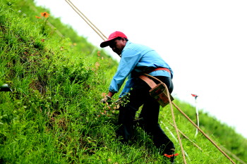 工人正在清除山体上的杂草。 本报通讯员 杨荣超 摄