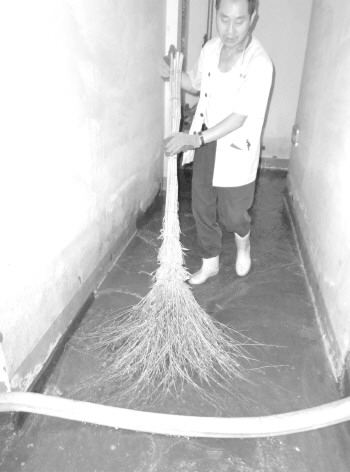 27日,星河城11号楼的地下室不停传出机器的轰鸣声,同时伴有“哗、哗”的声音。记者走进地下室看到,原本能没过脚面的积水已经浅了很多,绕过一个弯,3名男子正每人拿着一把扫帚将水推向地下室的一角。在那个角落里,一个抽水泵连着一根塑料管,一直延伸到楼外,将积水不断排走。