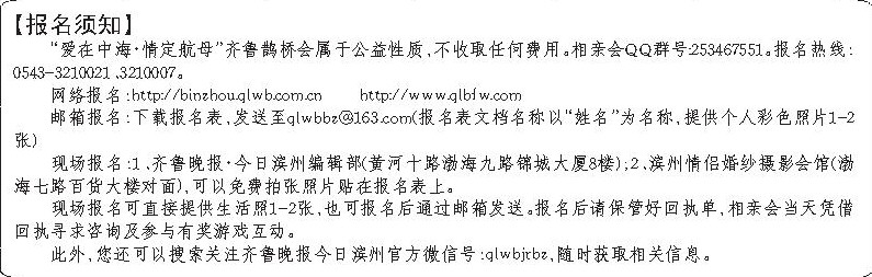 “爱在中海·情定航母”齐鲁鹊桥会属于公益性质,不收取任何费用。相亲会QQ群号:253467551。报名热线:0543-3210021、3210007。