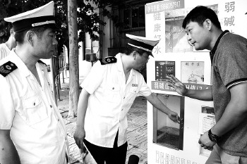 执法人员对城区现制现售水机进行检查。本报记者 李倩 摄