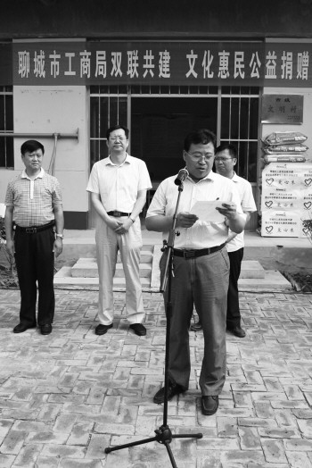 聊城市工商局局长为双联共建帮扶村捐赠爱心物资。