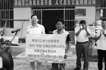 在爱心捐赠仪式上,安利泰安、德州、聊城三地营运经理刘东旭说,近年来安利公司通过多种方式践行企业社会责任,回馈社会。通过公益助学、爱心捐赠等活动,让弱势群体感受到暖意,用真情回报社会;聊城市工商局副局长罗本江表示,聊城市工商局力争以出色的成绩完成帮包任务,为王贯庄村多办好事,多办实事;希望与王贯庄村全体村民一道,为建设王贯庄村的美好明天奉献力量。