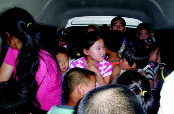 7月28日晚7时,夏津交警大队民警在308国道巡逻时,发现一辆接送暑假辅导班孩子的黑校车,该车核载人数为7人,实际却坐了17名小学生,超员率达171%。本报记者 张磊 通讯员 滕兆来 摄影报道