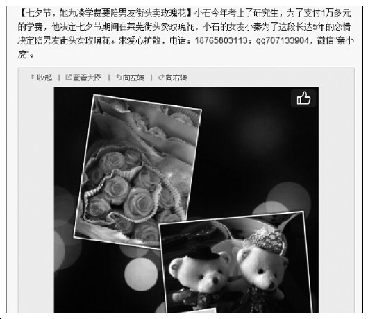 本报7月29日讯(记者 陈静) 大学生创业如今已近成为社会的热点问题,每到假期就会看到商场里有大学生打工。近日,微博、朋友圈中转发了一则消息,“七夕节,她陪男友上街卖花”,据了解,卖花的两人都是在校大学生,他们要在七夕节期间卖花,来攒学费。创业的主人公小石和小秦是一对情侣,小石今年考上了研究生,为了帮家里分担负担,两人在七夕期间在网络上售卖鲜花。他们开始售卖才几天,虽然当前销售状况并不乐观,但两人依旧保持乐观的态度。