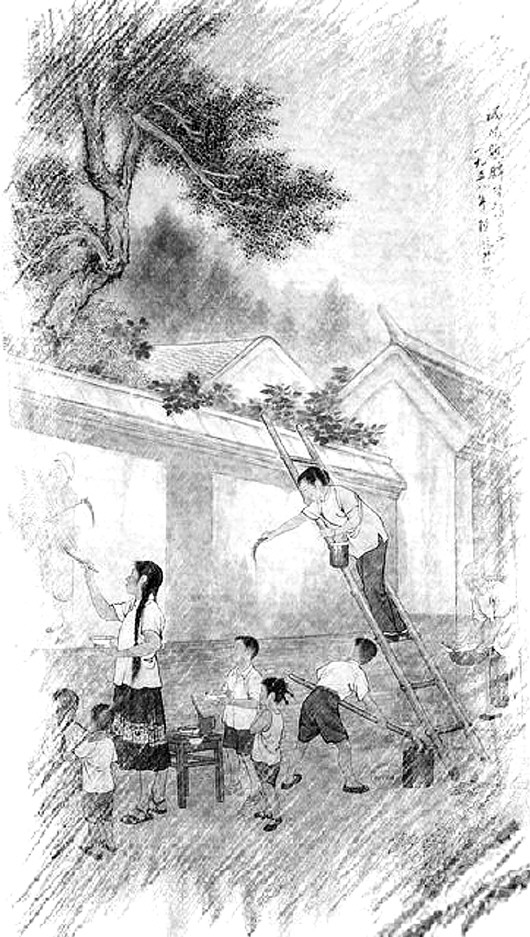 由于市文联街头诗画影响大,各区文化馆也跃跃欲试。当时市北区文化馆长刘烨非常重视,反复研究和筹划,从申请经费到每期策划,从书写、插图到勘察地点,事必躬亲。由刘学明任编辑,陶纪毛笔抄写,吴纯强插图。第一期是1959年创刊的,地点在大庙山出口对面的辽宁路上,竖立一块广告牌,“诗画配”就贴在大牌子上,没有玻璃框。虽然简陋,但读者很多,非常受欢迎。后来,文化馆接受了读者的建议,街头诗画由辽宁路挪到市场三路西头与中山路拐角处,修建了玻璃橱窗,诗画配就贴在橱窗内。