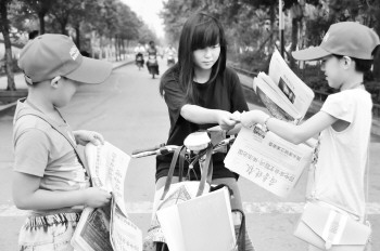 小报童高艺涵和高子涵向路人竞相推销自己的报纸。