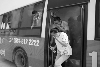 7月30日上午,德州市公共汽车公司在东北城广场举行公交逃生演练。在模拟火灾现场,乘客掩住口鼻逃出冒着浓烟的公交车。