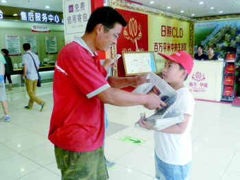 小报童张湛在大润发售报。 实习生 徐国华 摄