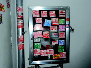 记者随机进入两栋居民楼,搬家、装饰、开锁换锁、家政服务……各式小广告充斥楼道,洁白墙壁成了“大花脸”。电梯里的小广告贴满四壁,从一楼到十七楼,入住居民寥寥无几,小广告却不遗漏任何一层,尤其每一层的消防箱,玻璃外罩成了“广告栏”。