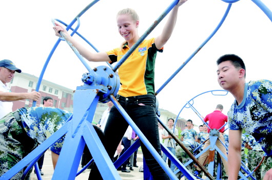 澳大利亚学员Simone Lees体验固定滚轮。 本报记者 陶慧聪 摄