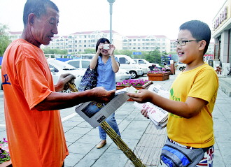 30日,小报童孙书鸿的妈妈拿手机为正在卖报的儿子拍摄视频。孙书鸿妈妈说:“她儿子利用暑期时间挣零花钱,长这么大是第一次,她想把儿子卖报的情形做成视频,为儿子成长留个纪念。” 本报见习记者 陈乃彰 摄影报道