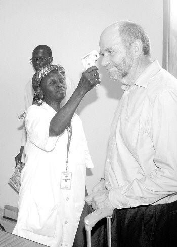 4月10日,在几内亚首都科纳克里,当地机场工作人员用仪器检测准备登机的乘客。 新华/法新
