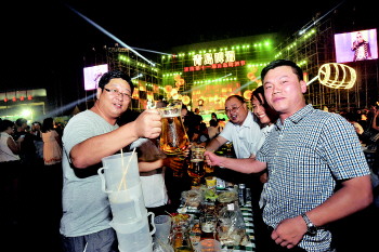 与啤酒节现场人山人海的场面形成呼应的是,围绕着啤酒节场区的小摊小贩人流络绎不绝。一位卖衣服的摊主告诉记者,“啤酒节一下子把这里的人气带旺了,我们也跟着沾光了,一晚上比平时能多卖出几件衣服。”
