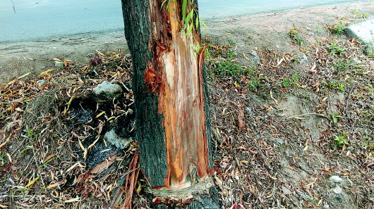 7月28日,热心市民反映,相公庄镇平普路袁庄村路口往东至小康大坝路段行道树破坏严重,两侧的行道树根部外周被砍、树皮被剥甚至还有火烧的痕迹。