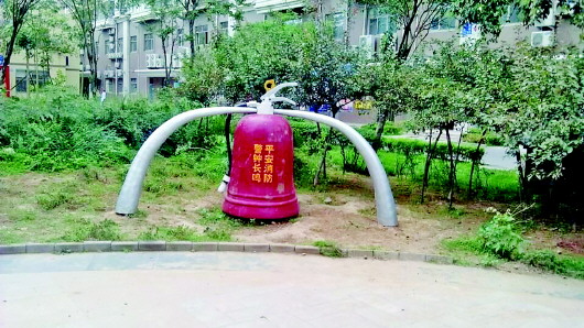 盛世花苑小区位于高新区康虹路。7月30日,小区居民孙先生指着小广场上一个标有“平安消防,警钟长鸣”的红色金属消防警示钟,向记者抱怨,“你看看,一米多高,块头不小,以前就安在我家楼底下草坪上,占用了绿化带,破坏原来的环境。”孙先生表示,6月中旬左右,小区门口的欧式风情长廊上也安装了8块大红色消防宣传牌,每块长2米、宽1米左右。“看着挺别扭,不伦不类很突兀,和周边环境不搭。”